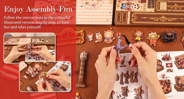 The Animal Carnival Wooden Music Box brings that memory back to life. Piece by piece, as you build the stage with your own hands, you are not just crafting a model — you are recreating a moment of pure joy. And when the melody begins to play, it’s like stepping into a warm memory where time slows down and happiness feels simple again.